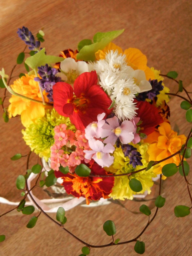 庭に咲く花を寄せ集め、小さなブーケを作りました。