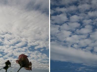 鱗雲に向かって咲く20年目のピンクのバラです。