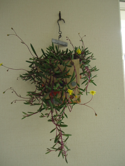 手作りの鉢にルビ-ネックレス、 ぷりぷり感が好きです 黄色で小さな花が咲きはじめました