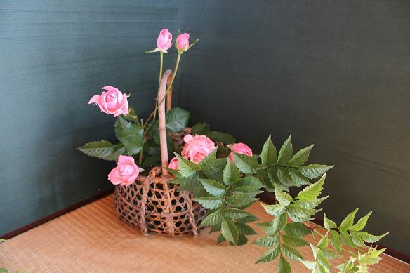 ノウゼンカズラの葉っぱと、咲き綻んだピンクのバラを。