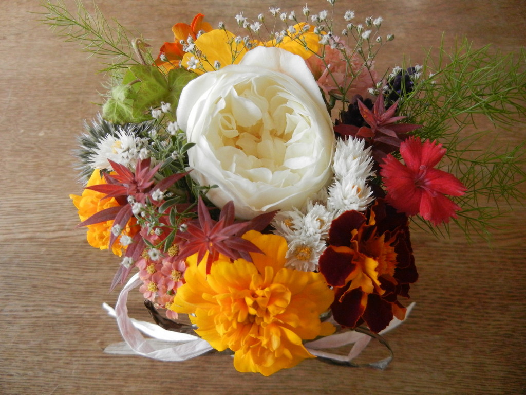 秋も深まり、庭の花が少なくなってきました。庭の花を寄せ集め、ミニブーケを作りました。