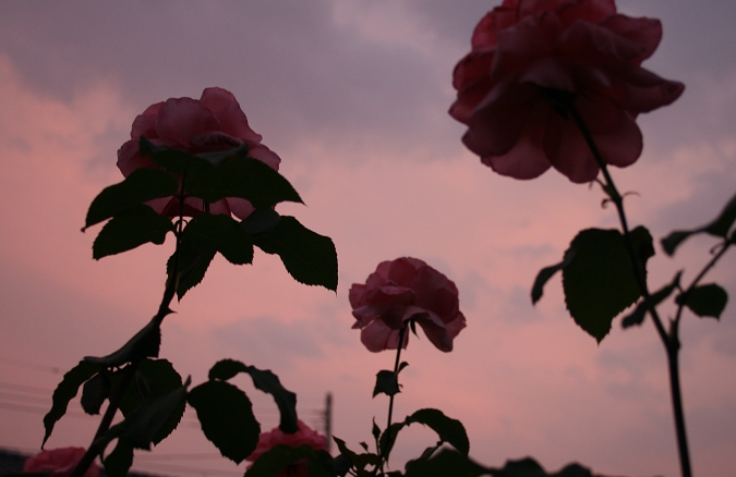 美しいシルエットですね。夕闇にはっきりした薔薇の立ち姿が清々しいと感じ入りました。うそっこのちょうちょを見つけてくださって、とてもうれしかったです。(^。^)y-.。o○