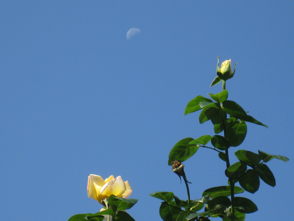 パーゴラの上に伸びているツルピース・・・ お月様を見ているのかな・・