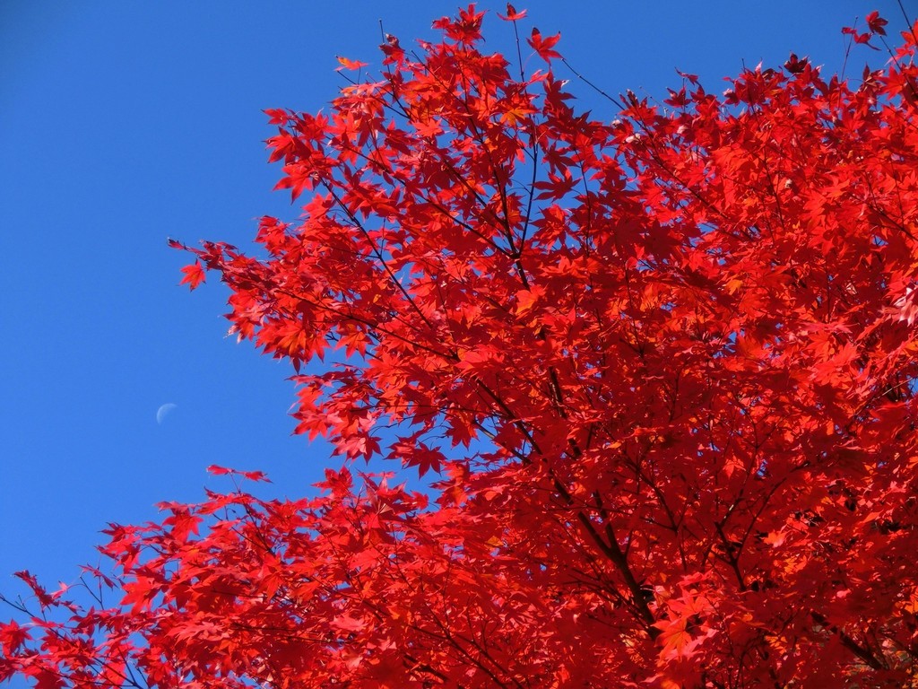 公園の一角にあるモミジが真っ赤に色付いて真っ青な空に映えています。空には丁度月の姿がありました。
