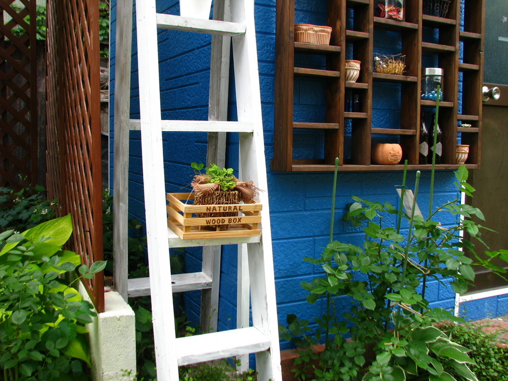 小屋前の飾り棚