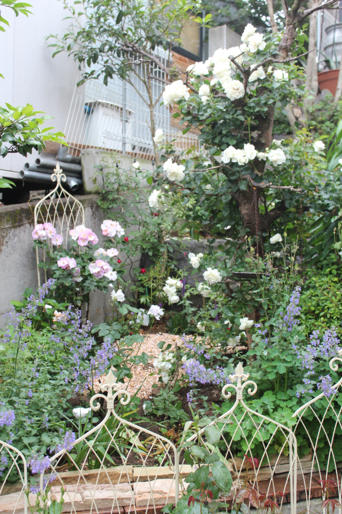 枯れ木に誘引している【ホワイトメイでぃランド】と、【ブルーフォーユー】。 手前のキャットミントは年を越して徐々に広がってきました。