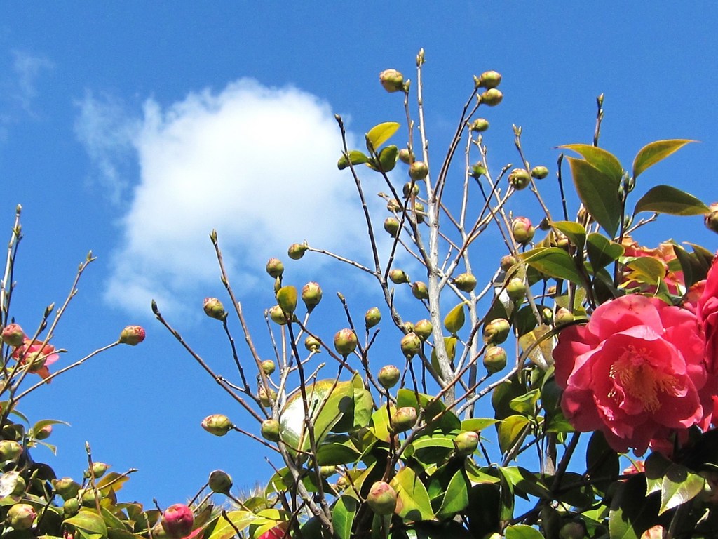 椿の蕾がたくさん、見上げたらぽっかり綿菓子みたいな雲が…。
