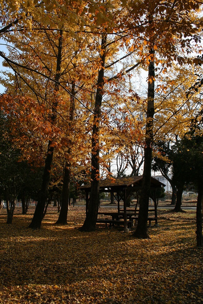 金色の 小さな鳥の かたちして 公孫樹散るなり 夕陽の丘に 与謝野晶子の歌を思い出す、銀杏の葉っぱの黄色い絨毯です。