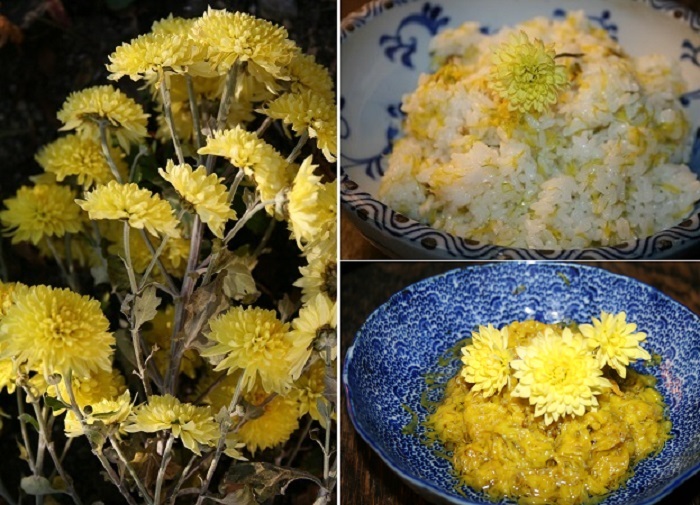 黄色の小菊を湯がき、菊ご飯と酢の物を
