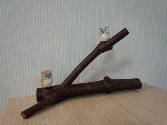 穴をあけて斜めに枝を刺して塗装し、子供部屋に落ちていたフクロウさんをくっつけたシンプルな物ですが、自分では完成度高いと思ってます!来春庭に飾る予定です(●^U^●)