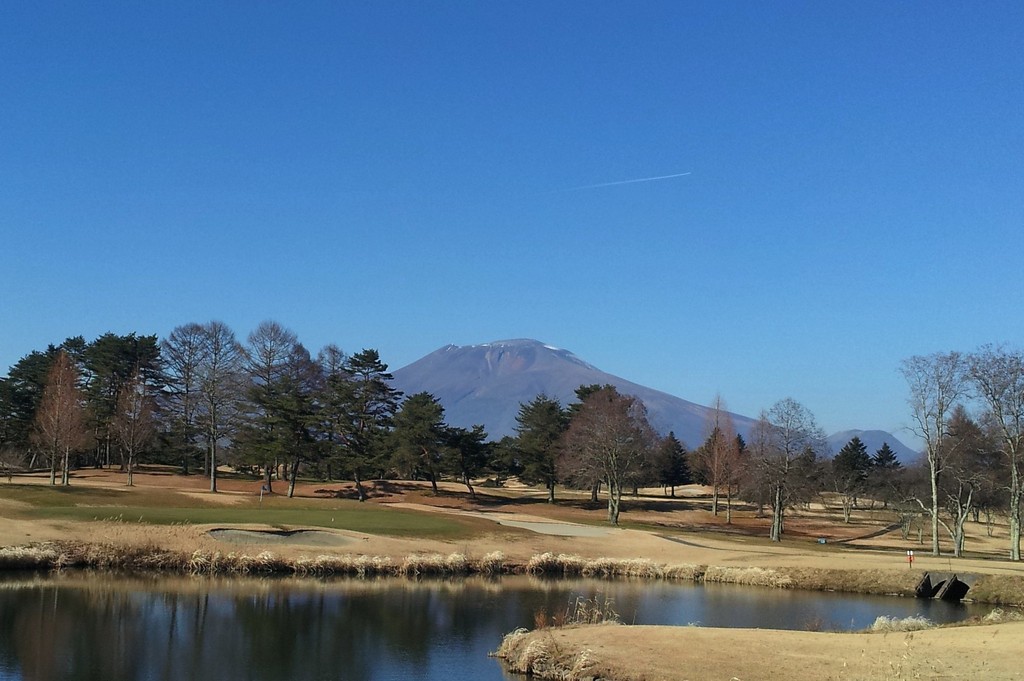 これは軽井沢72ゴルフコースから望む浅間山です。この方角から見た形が最も好きです。丁度山頂の上に飛行機雲が出ていました。