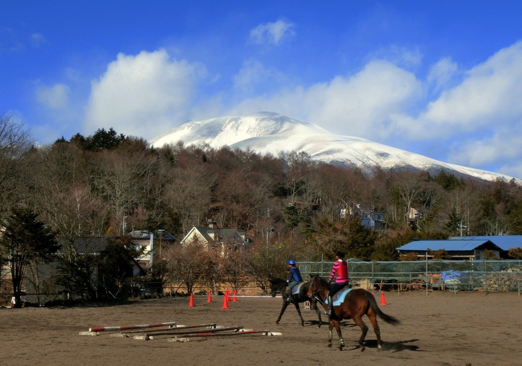 こちらは近所の乗馬クラブから見た浅間山です。馬場では子供たちが馬場馬術の練習をしていました。
