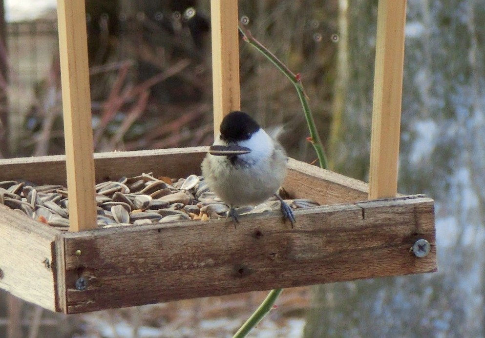 ヤマガラやシジュウカラと競いながら加えたヒマワリの種。