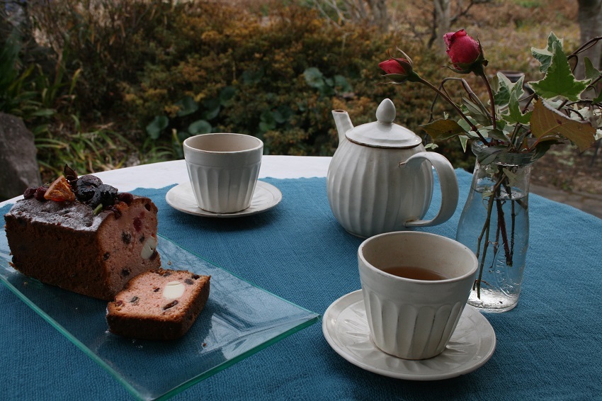 剪定は、来年かな?!ケーキも美味しそうですが、テーブルセンターとっても素敵な色ですね、こんな色のセーターがほしいと思っているところです。