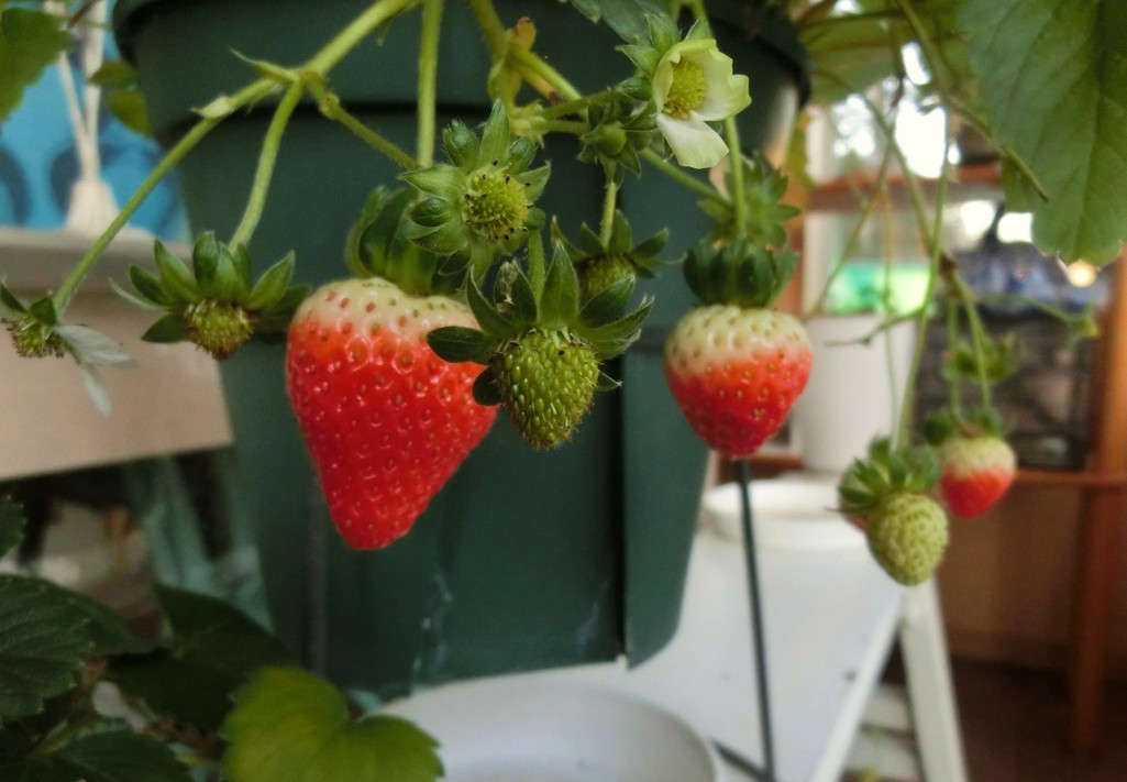 今朝の軽井沢の気温は-11度。でも鉢植えで3年目を迎えているイチゴは、サンルームの中で順調にたくさんの実をつけています。