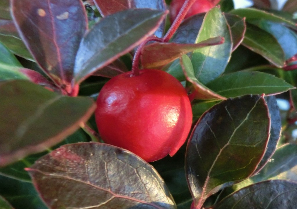 これは寄せ植えの鉢に植えているチェッカーベリー。小さなリンゴかサクランボのようで可愛い実です。