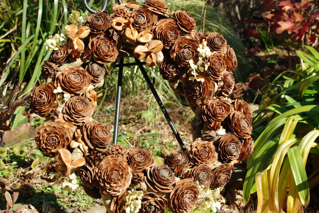 アケビの蔓でリース台を作り、そこにシダーローズや椿、シャラ、アナベルを飾ってみました。直径40cmです。