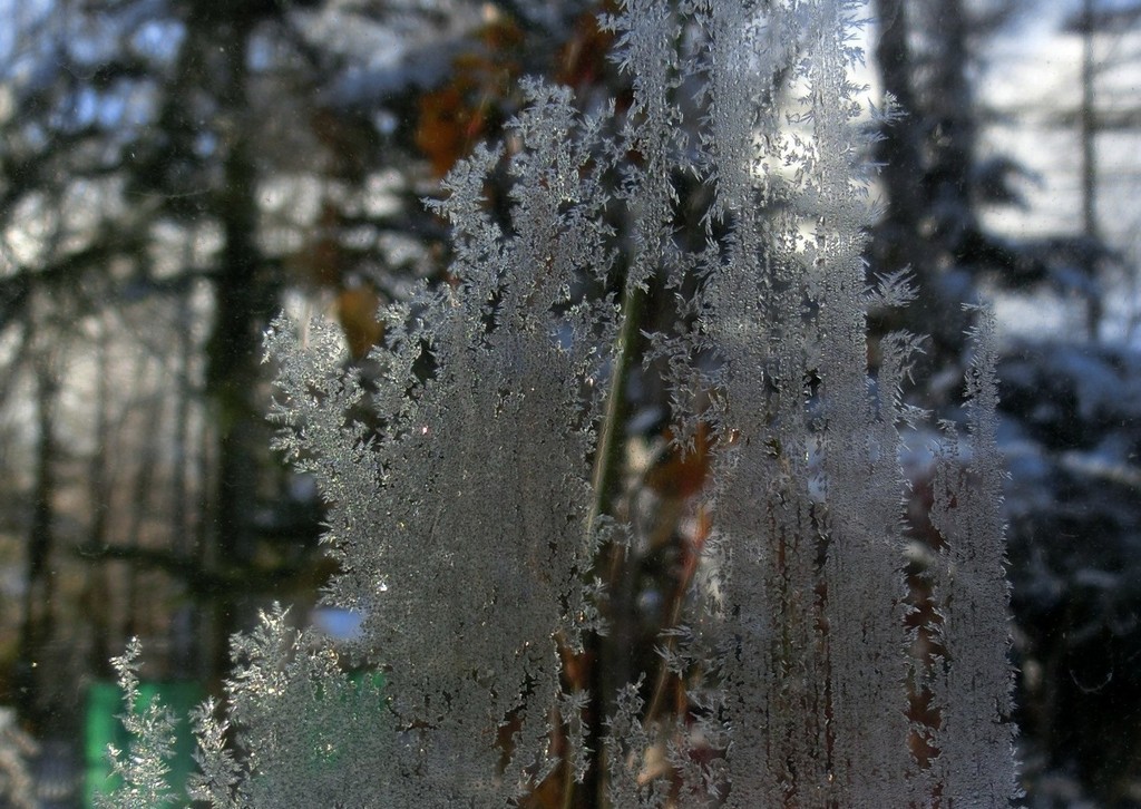 これは朝8時半ごろ朝日が射してきたころ撮ったのですが、この時間でも外気温は-10度近いため融けずに綺麗な結晶を維持していました。