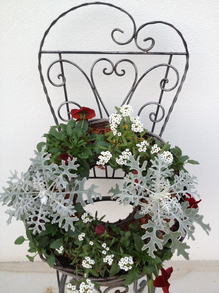 クリスマス用に白とダークレッドのスミレで寄せ植えをつくりました。