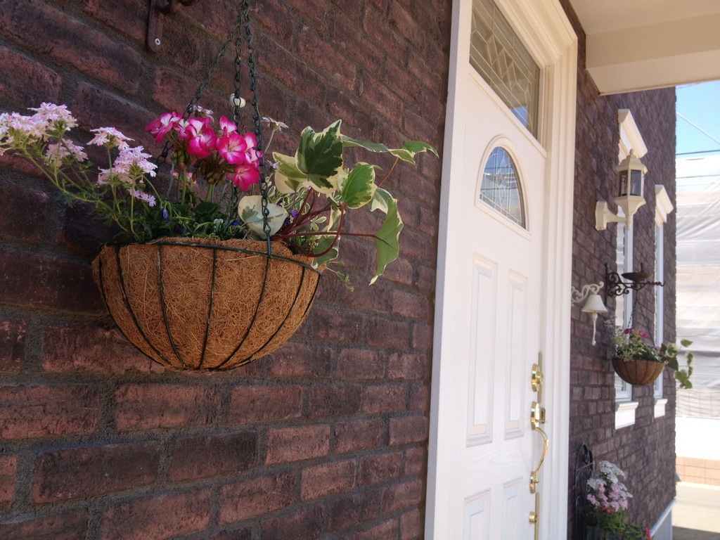 玄関の両脇にシンメトリーにフラワーハンギングを設置しました。