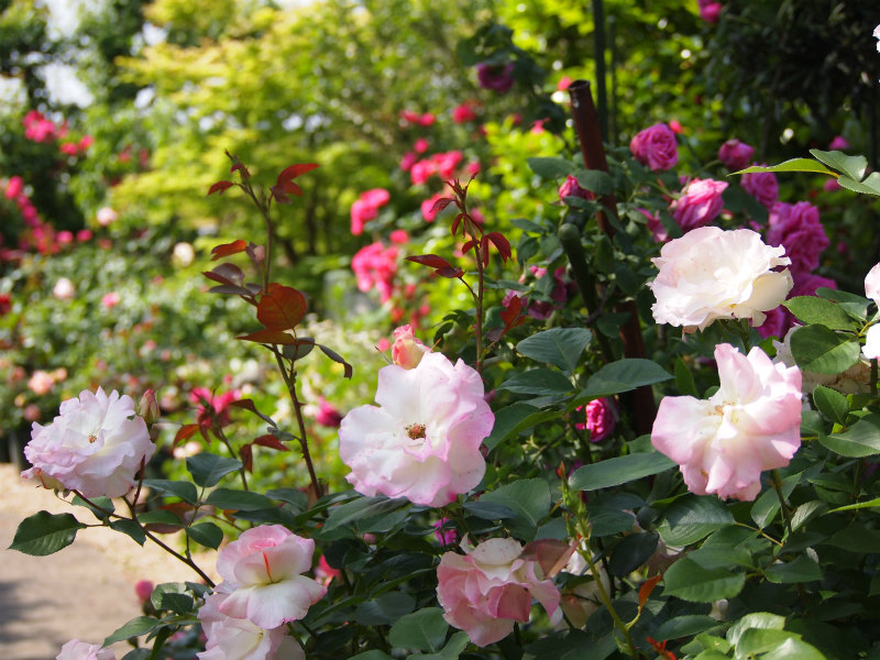 この写真も素敵ですね。手前のピンクのバラ、そして背景のブルー、パープル、濃いピンクと、色のハーモニーを感じます。