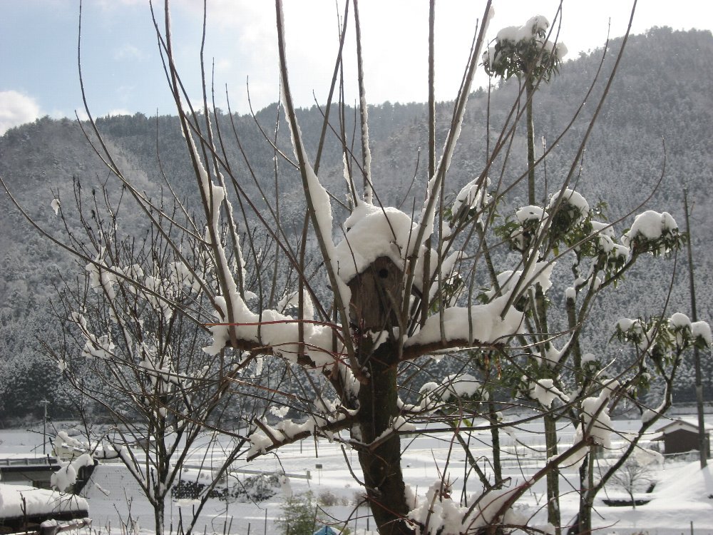 夜の間に雪が降りました。巣箱も雪屋根に。