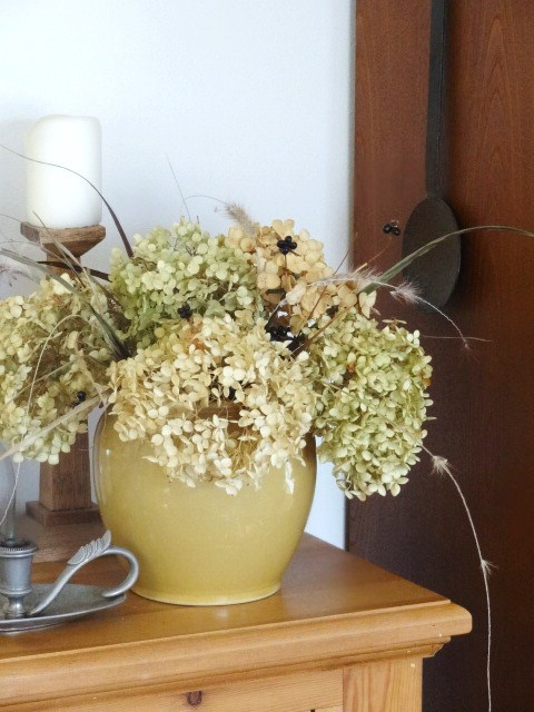 庭の白山吹の真っ黒な実やグラスの葉っぱでアナベルをちょっぴりおめかし♪