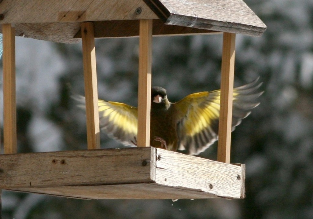 エサ台に着陸態勢のカワラヒワ。