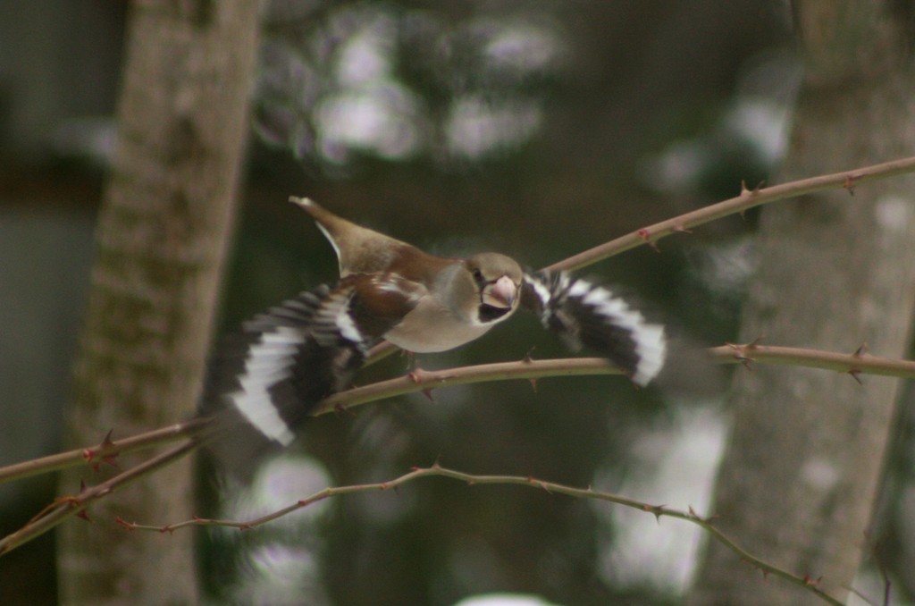野鳥の世界も餌をめぐってのバトルが大変ですね、。ライブで見ることができるなんてうらやましい~隈取りをした歌舞伎役者のようなシメは迫力ありますね。羽ばたきがよく撮れてますね。