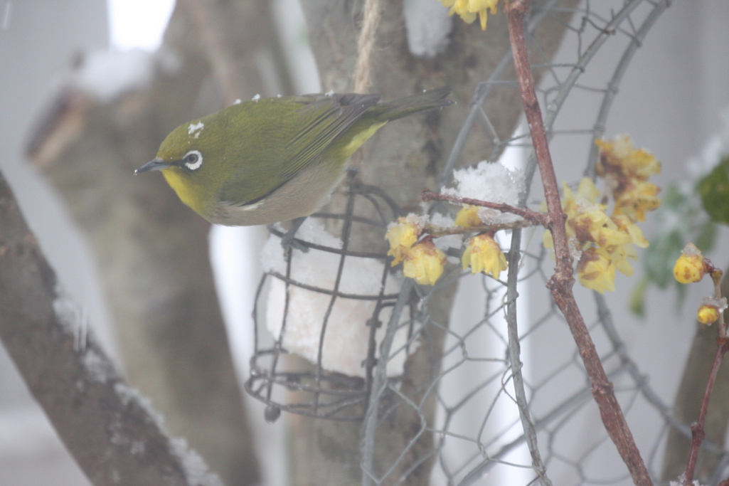 雪の中のメジロさん絵になりますね!蝋梅ですか?絵になりますね!