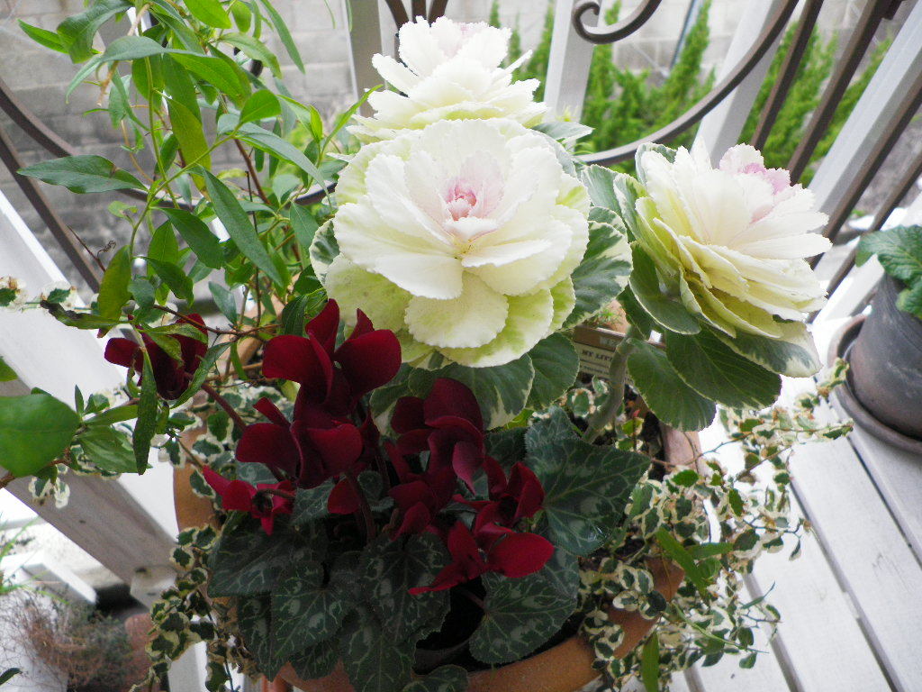 ハボタンやプミラのやさしい色と相まって、シックでいて華やかな寄せ植えですね。