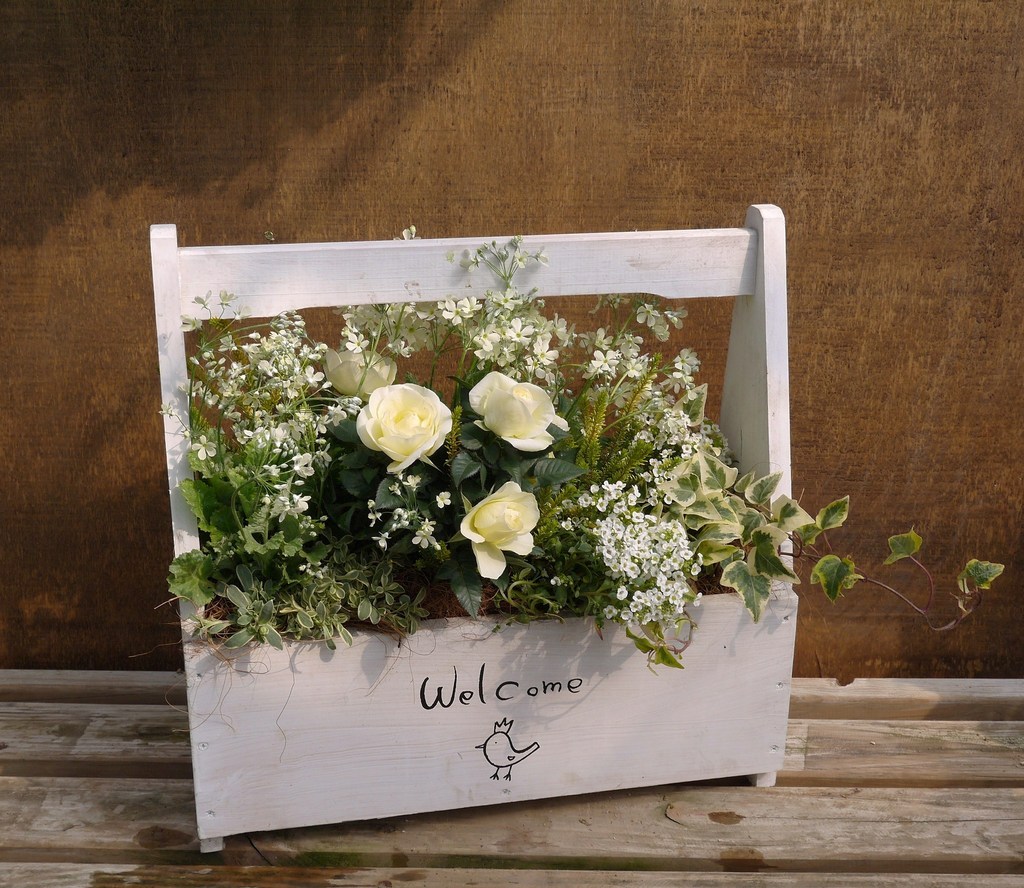 淡いクリーム色のミニバラがきれいだったので城の木製ボックスに植えてみました。