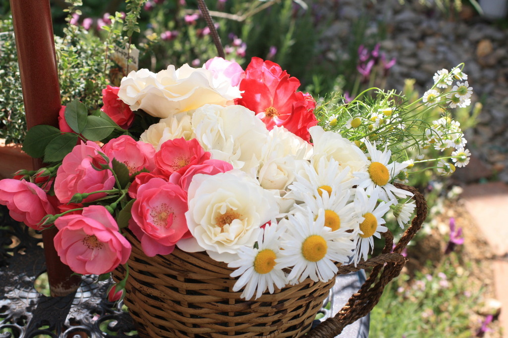 溢れるほどの花達を温かな光で見事な表現です、籠や周りの風景も入れた所がタ-シャの写真集の1枚かと思うくらいナチュラルです。☆3つ