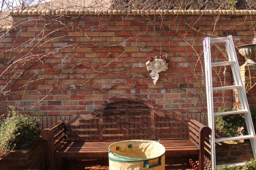チークオイルを塗りなおしたベンチの所で棘と格闘しながら、剪定と誘引・・コンスタンス・スプライ、ガートルード・ジェキル、フランソワ・じゅらんビール