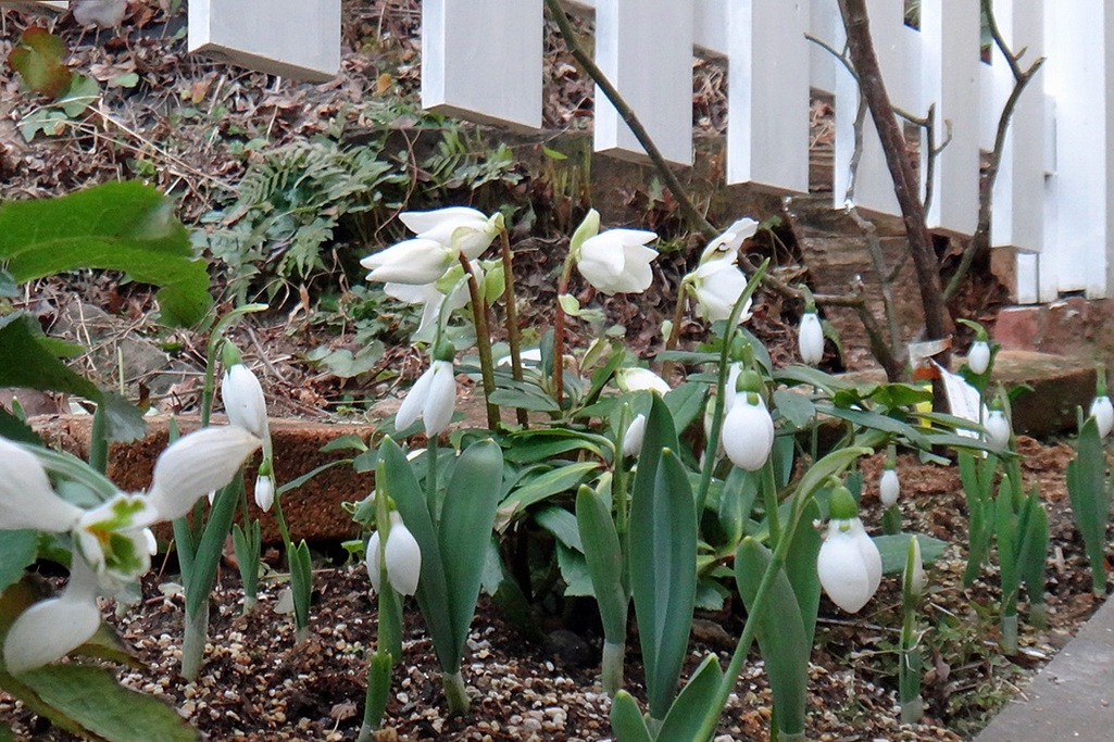 トリプルホワイト!フェンスの足元に咲く白花が明るくていいですね。スノードロップもかわいいし私もやってみようかな。