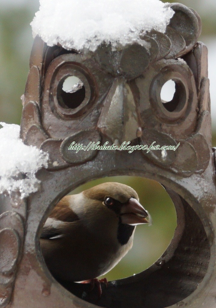 フクロウのオブジェの中から顔だすシメ君・・何ともユーモラスですね!ibuhatoさんの動画「踊るシメ」(笑)何度見ても笑えます~BGMがいいですね♪