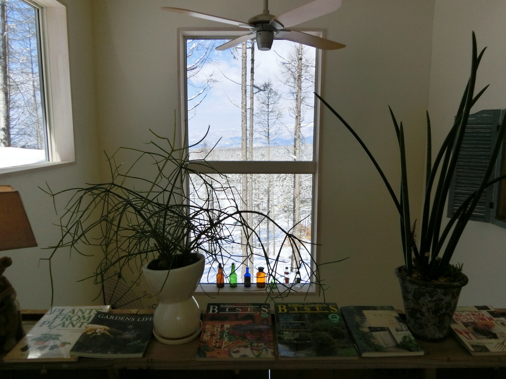 「BISES」1992創刊1号には自宅のベランダガーデンが、1993 6号には自宅のインテリアが紹介されています。吹き抜けのあるロフトには乾燥に強いミルクブッシュとスタッキーを。 まだ月10日の利用なので多肉の植物が安心です。
