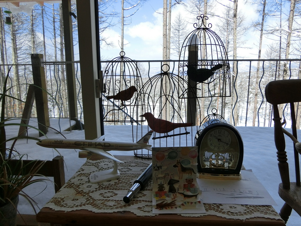 2014.3.6 窓辺のインテリアにワイヤーの中に鳥が4羽入ったデコを新たに持ってきました 昨日までの雪がやみ青空も出ていいお天気に。