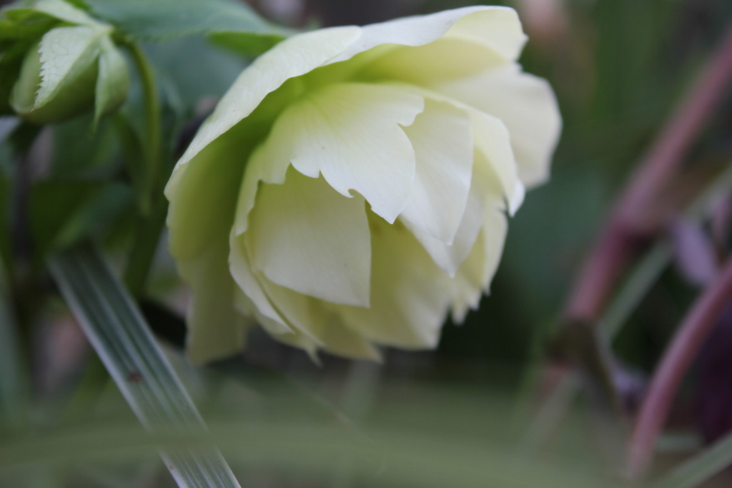 ほんのりグリーンがかった白のダブルが 俯いて咲いています。