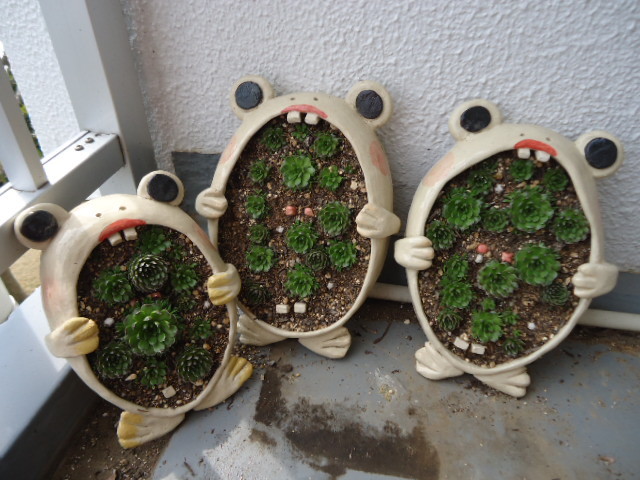 多肉植物、爪蓮華は群生する植物です 手作りのカエルの鉢にお腹いっぱいになるように 楽しみながら育ててます 一つ、一つに赤ちゃんがいっぱい付いてます