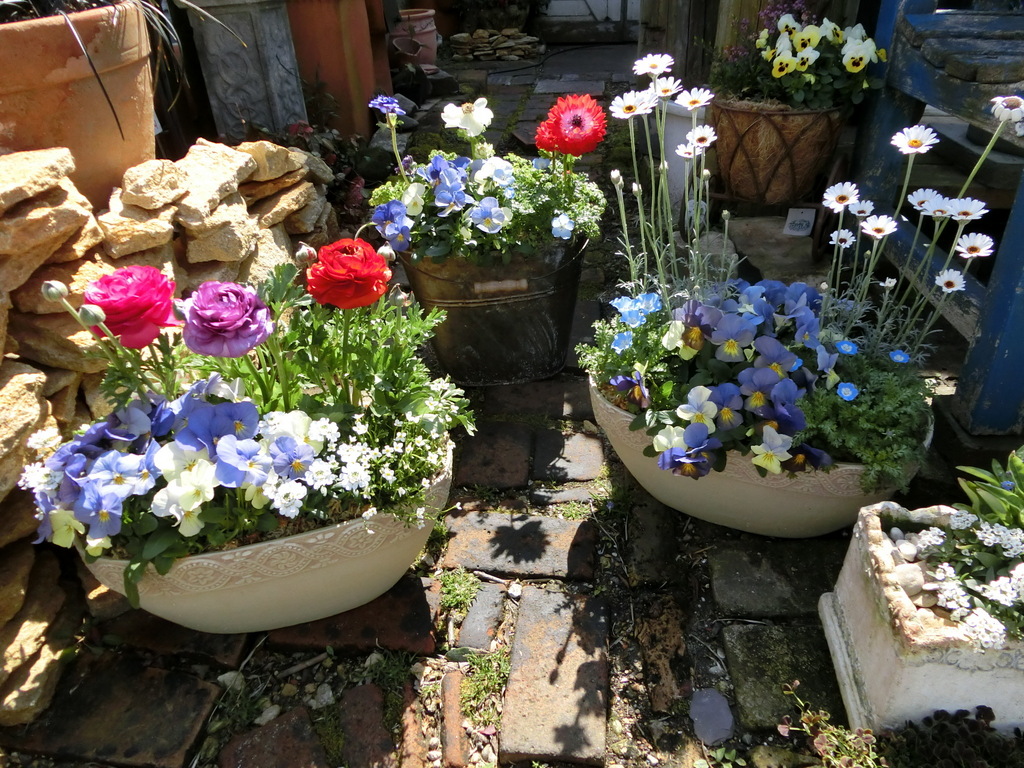 左:ラナンキュラス・ヒナ草・イベリス・パンジー天使の誘惑 中:アネモネ・ネモフィラ・パンジー 右:ローダンセマム・ネモフィラ・パンジー