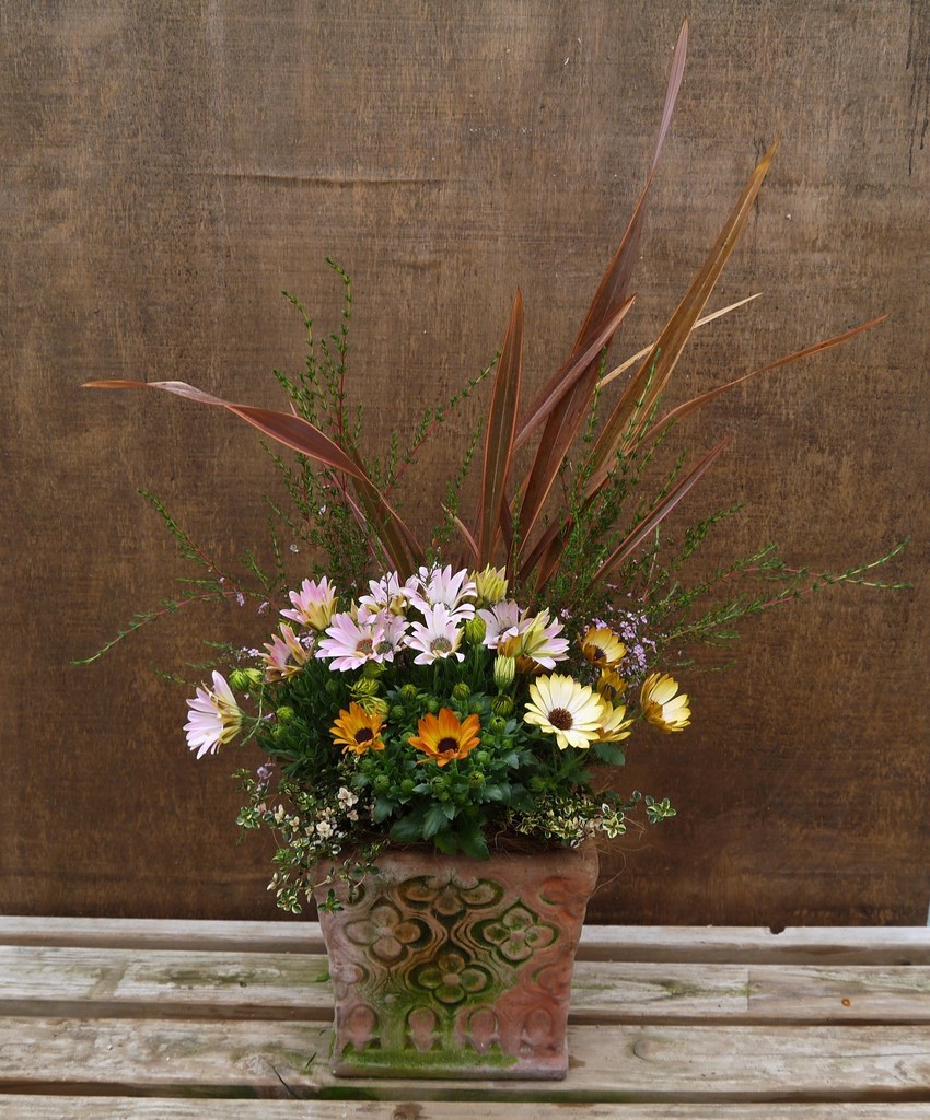 古びたテラコッタ鉢にオステオスペルマムを寄せ植えしました。