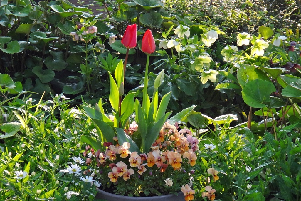 今年はチューリップの開花がだいぶ遅れています。 白いミヤコワスレも一緒に開いてきています。 クリスマスローズが奥にまだ咲いています。