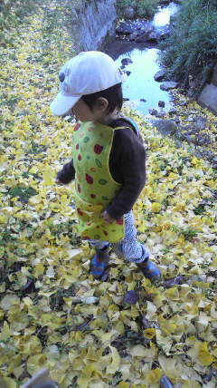 家の前の銀杏は秋風に吹かれカラフルシャワーと孫も喜ぶ