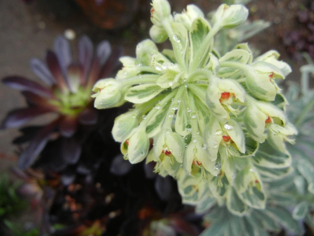 雨粒をまとったユーホルビアシルバースワンと黒法師