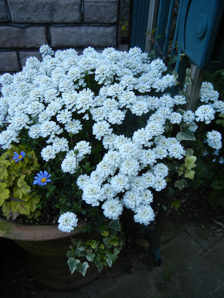 植えっぱなしオーケーのコンテナ・宿根イベリス、ヒューケラ、ブルーデージーなどの宿根草。時々球根をしのばせる。砂糖菓子のようなイベリスは花期が長くこぼれるように咲きます♪ 花後も葉をつけたまま冬越しをします。