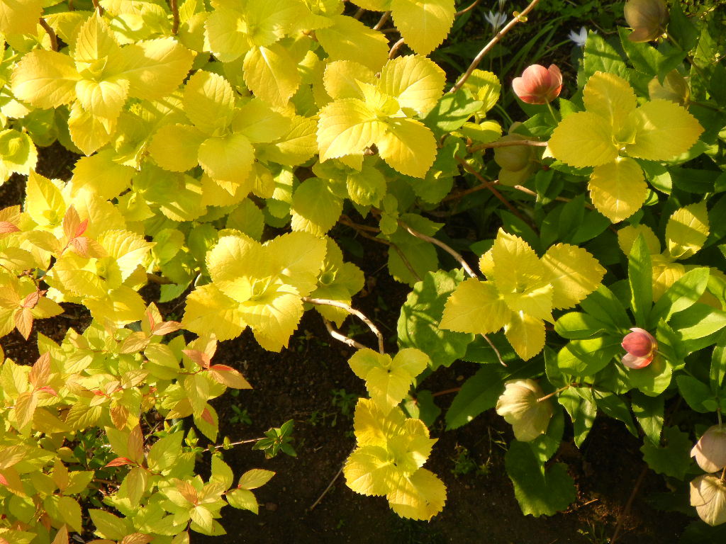 黄金葉アジサイ、シモツケゴールドフレーム・・芽ぶきの頃の葉はホレボレするようなメタリックゴールド!我が家にきて10年ぐらいになります。朝日に映えて綺麗です。