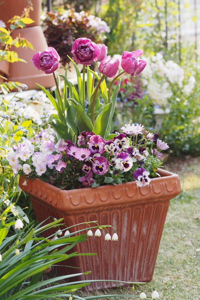 同じブルーダイヤモンドを使った我が家のひと鉢です。こちらはパープル系でまとめました(*^^*) オステオとローマンセダムの位置には実はムスカリが植え込んであったのですが、春の訪れが早い我が家ではチューリップとはやっぱり時期がずれちゃった^^;