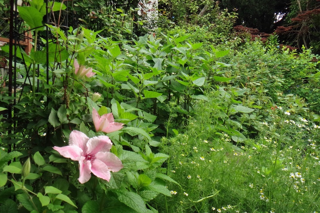 ハーブ畑にクレマチスがやさしい花色を添えています
