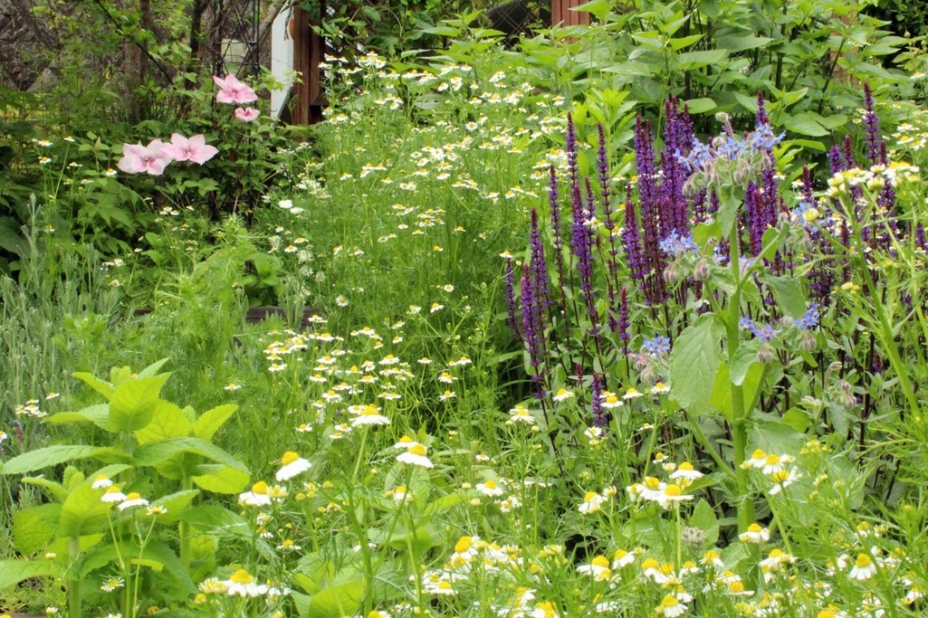 こぼれ種からこんなに茂って、ほかのハーブが押され気味・・・ ボリジも咲いてきています